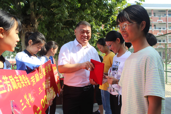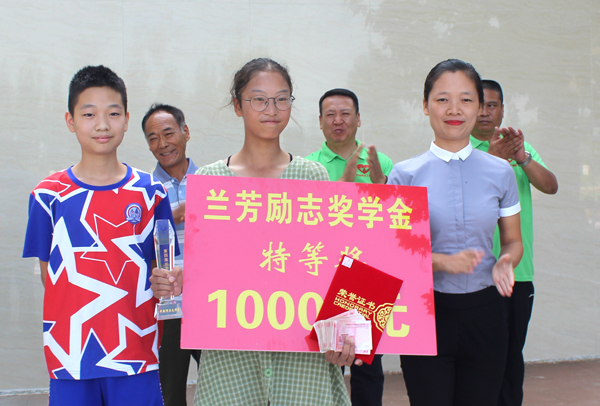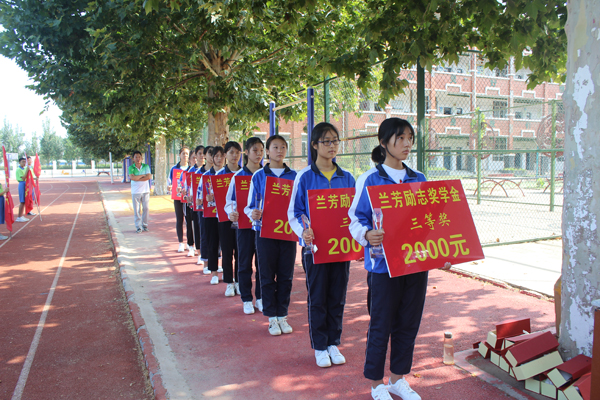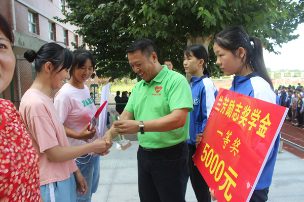 汪屯中学校长赵金生说:“我们学校是开封市禹王台区汪屯乡的乡村中学,原本教学条件和学习成绩都较为一般,自从2016年设立了开封市义工协会兰芳励志奖学金后,极大的促进了同学们学习热情,全校的学习成绩逐年提高。今年参加全市中招考试380人,庞冰倩同学以646分入围全市中招成绩前100名,获得奖学金的特等奖一万元,开封高级中学录取17人,河南大学附属中学录取6人,市第25中学录取19人。今年我校计划招生500人,报名人数已超过1000人。我们非常感谢刘兰芳女士对我们学校的大力支持,感谢她对家乡父老乡亲的热爱,我们也号召全校师生们向她学习,不但要考出好成绩,还要学习她有爱心、乐于奉献的精神。”