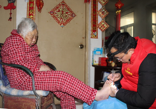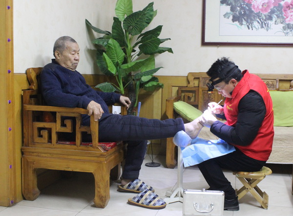 “王医生,你看,我这脚经你治疗后走路就不痛了,轻松多了,党和政府实施的这项居家养老服务真是太贴心、太温暖了!”12月27日,家住开封市示范区康平社区龙翔香格里拉小区86岁老人秦文斗,通过电话预约政府购买居家养老“修脚”服务项目后,河南安泰居家养老服务中心安排修脚师及时入户,用一次性修脚刀具娴熟地为老人解除了困扰多日的足部疾患后,秦文斗老人感受着修后的轻松,情不自禁地发出这样的感慨。为秦文斗老人提供上门修脚服务的修脚师王辉是杞县中心医院足病科的一名医生,自2004年以来就积极参加各种社会公益活动。16年来,他组织成立了杞县畅想未来志愿者协会,积极开展常态化“帮孤助老、助残助学、义务理发、修脚、证件物品丢失义务送还、环境保护等各类志愿服务活动,为解除老人们的足病困扰,王辉勤学苦练修脚技艺,与志愿者们一起进社区和各种养老机构,先后为上万名群众和老人义剪,为他们解除足部疾患,受益群众达5万余人次,先后荣获开封市道德模范、中国好人等多种荣誉称号。