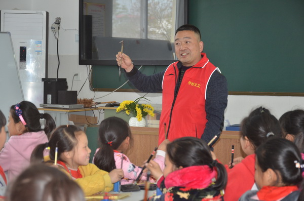 今年44岁的义工张宝峰,是中国书画家协会、开封市书法家协会、开封市老艺术家协会会员。他自幼酷爱书法艺术,喜欢钻研各种古文字的史书碑帖,主攻楷书、隶书、篆书和篆刻,受到实力派书法家夏建中等多位名家的言传身教,作品多次获奖。十年来坚持临池不辍,以艺修身,以艺养德。2017年他加入开封市义工协会,在深入农村开展助学活动中得知,乡村学校缺少书法老师,便决定参加协会的乡村学校支教活动,并于2017年4月12日,接受市禹王台区汪屯乡马头小学的邀请,为该校的同学们义务讲授书法课。四年来,无论天寒地冻、刮风下雨,还是烈日炎炎,他都驾驶着自己的私家车,每次往返30多公里,按时到该校授课,从不耽误一节课。到目前为止,已义务授课320多节,累计奉献900多个工时。