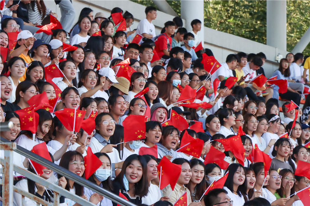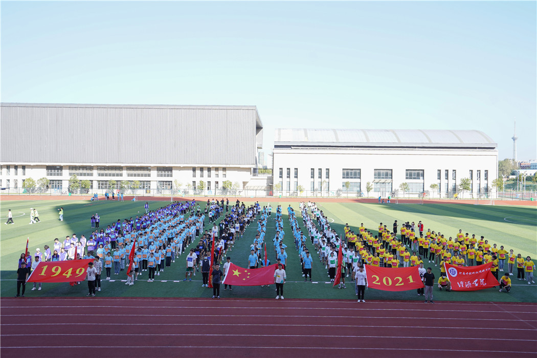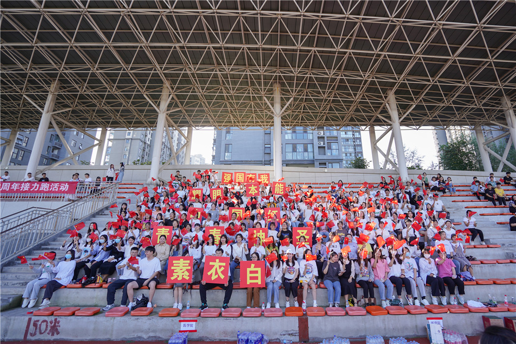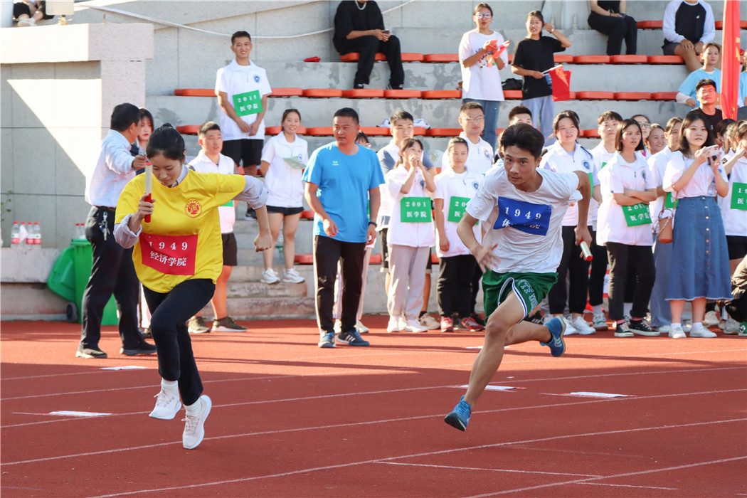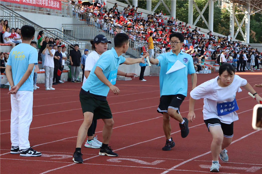 随着法令枪声响,来自各个学院、身着不同颜色服装的运动健儿手持接力棒,像离弦的弓箭一样朝着同队队友处奋力奔跑。他们健步如飞、搏尽全力,努力以最快速度将接力棒交给下一位队友,接力棒在每一队的72名运动员中传递着。随着比赛逐渐接近尾声,看台上观众的加油呐喊也逐渐白热化。各学院的观众挥舞着手中五星红旗为运动员们高声欢呼着。“传承红色基因,接力中国精神”“同奔跑 担使命 我与祖国共成长”“庆祖国华诞 绘理想蓝图”等加油标语在看台上随处可见。各学院最后一棒选手在一片叫好声中冲过终点线,比赛圆满落幕。
