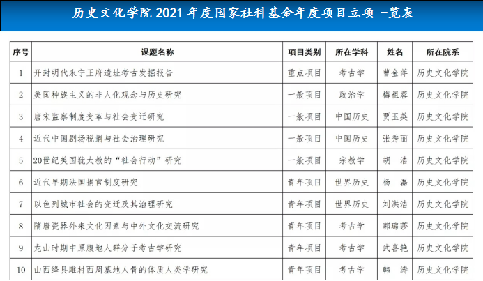 近日,全国哲学社会科学工作办公室公布了2021年国家社科基金年度项目立项名单。历史文化学院共获批10项,立项数量居全校首位,充分彰显了近年来学院在科研团队建设和高水平课题申报方面的显著业绩。