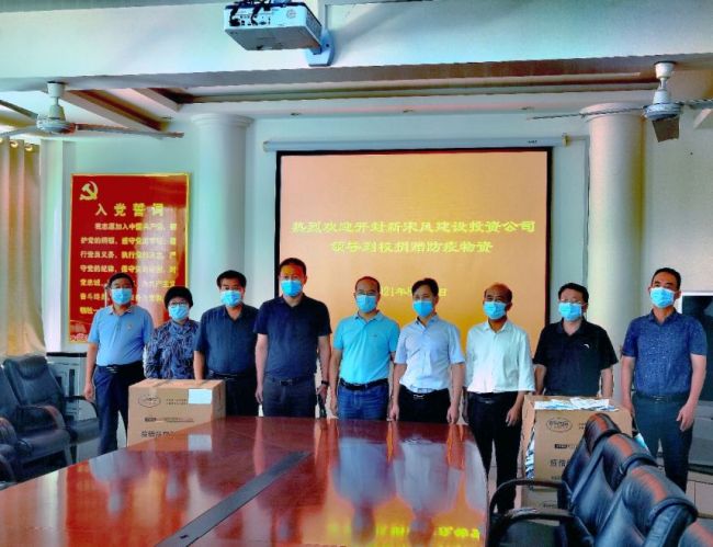 8月25日上午,开封新宋风建设投资公司总经理辛军海、副总经理倪银伟一行亲临我校,现场捐赠医用口罩1.2万只。校长谢文忠和校领导班子成员对新宋风建设投资公司领导的到来表示了热烈欢迎,由谢文忠校长代表学校接受了企业的捐赠。