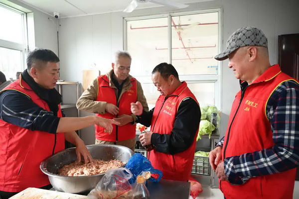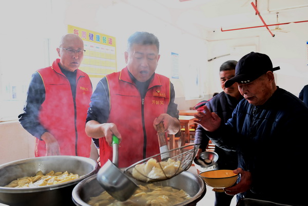 演出现场热闹非凡,厨房里也忙得不亦乐乎。义工们用带来的饺子馅、大白菜、面粉、小磨香油、五香粉等各种调料,开始为老人们包起饺子,干得热火朝天,和面、剁大白菜、拌饺子馅、擀饺子皮、包饺子、下饺子等,既有分工又有合作,那个环节跟不上,就有人去立即替补上,有效地保障工作顺利进行,不“掉线”。不一会儿,一盘盘摆放整齐的饺子就摆上打托盘上。中午12点半,吃饭的铃声响了,老人们吃着香喷喷的饺子赞不绝口,一个劲地说,“好吃,真好吃”。没有华丽的言语,但体现着对义工们辛勤付出的内心赞誉。