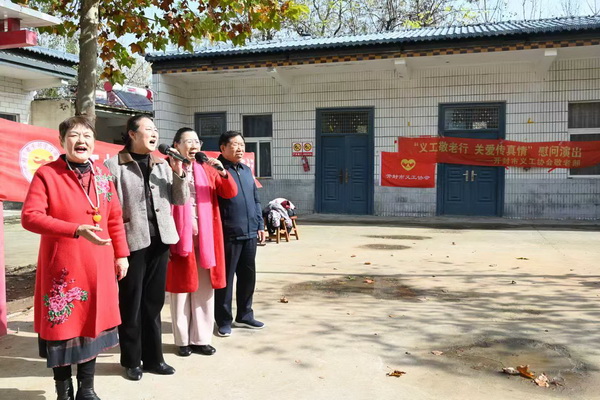 范村乡敬老院是开封市义工协会的敬老基地。多年来,义工们时刻不忘住在这里的孤寡老人们,每逢过年过节和节假日,都会联合民间文化团体,给老人们送来时令食品和各种水果,有时还自带各种食材给老人们包一顿饺子,或者蒸上一大锅香喷喷的卤面;疫情期间还给老人们送医送药和防护用品;天冷了,还给老人们送来御寒的衣物。每次活动,参加活动的艺术家们都会给老人们表演各种节目,唱几段老人们熟悉的传统豫剧,跳几场传统的舞蹈,博得老人们的开心。