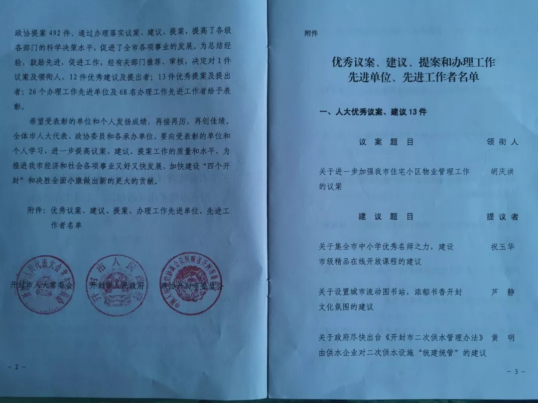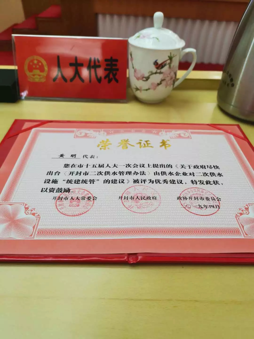 市人大代表黄明在市十五届人大一次会议上提出的《关于政府尽快出台<开封市二次供水管理办法>由供水企业对二次供水设施“统建统管”的建议》被评为优秀建议